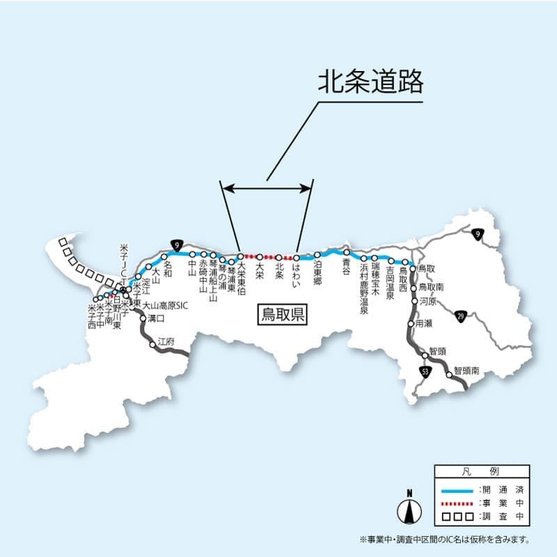 北条道路の整備により、通過交通と生活交通が分離されることによる安全性の向上や、高速道路ネットワークが整備されることにより、鳥取県中部地域の観光の活性化、企業進出、医療機関へのアクセス性向上に寄与することが期待されています。